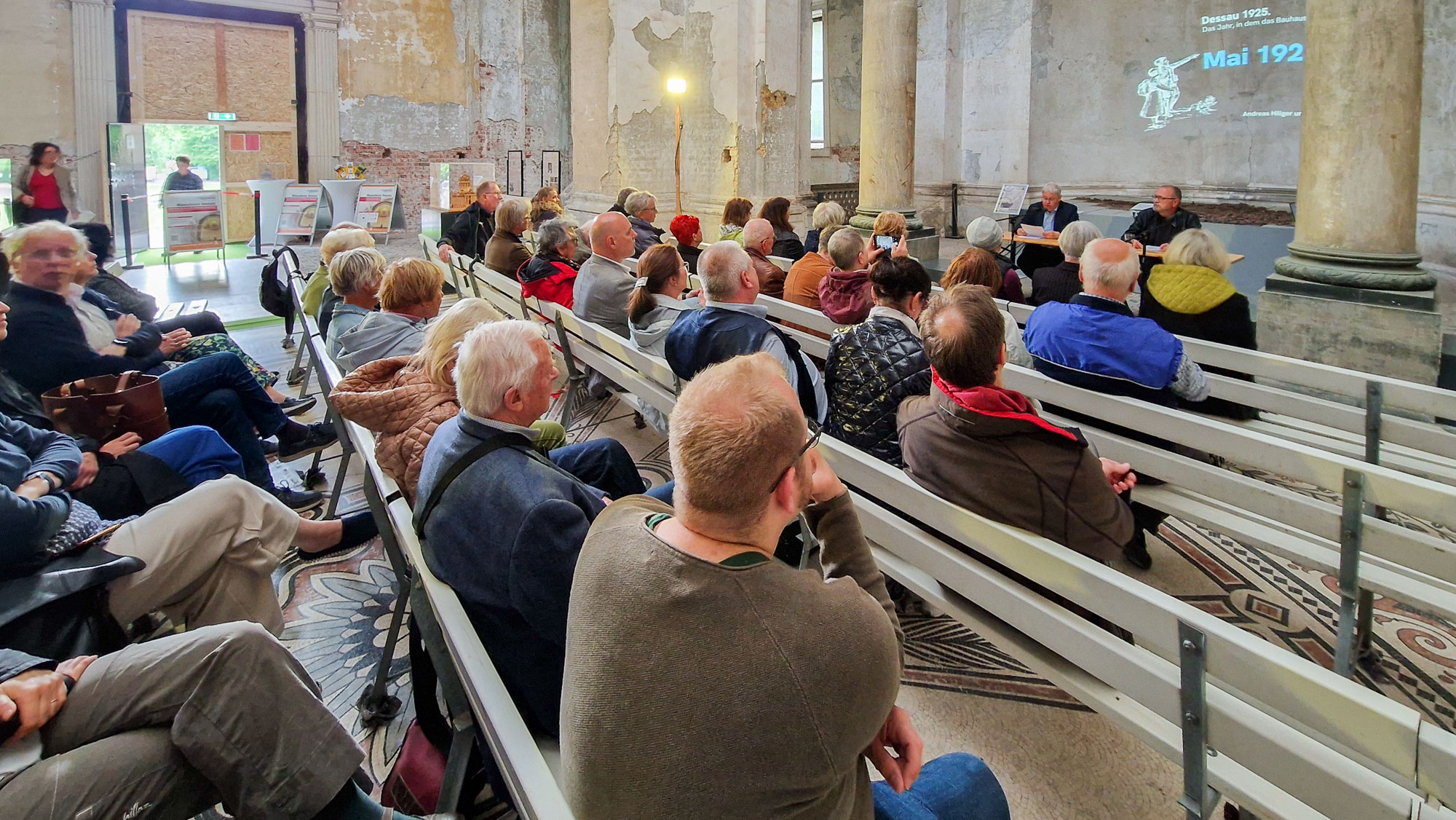 Eine große Rolle in der Lesereihe spielt auch, wie sich das Bauhaus und die Bauhäusler im Jahr 1925 nach und nach in Dessau etablierten. Mit den Stimmen der Vertreter des Magistrats sowie der SPD- und DDP-Fraktionen votierte der Dessauer Gemeinderat am 23. März 1925 mehrheitlich für die Ansiedlung des Bauhauses in Dessau. Damit konnte das in Weimar aus politischen und finanziellen Gründen nicht mehr gelittene Bauhaus in Dessau als „Hochschule für Gestaltung“ eine neue Heimstatt finden. Wichtige Fürsprecher des Bauhauses in Dessau waren der liberale Oberbürgermeister Fritz Hesse, der Generalmusikdirektor des Dessauer Friedrichs-Theaters Franz von Hoeßlin, der freigeistige Flugzeugpionier und Erfinder Hugo Junkers und der Landeskonservator Ludwig Grote, die sich vom Bauhaus nicht nur die Lösung vieler sozialer Wohnungsprobleme für die Arbeiter der Industriereviere versprachen, sondern sich auch innovative kulturelle Impulse für die Stadt erhofften. Von Beginn an war das Bauhaus aber auch heftig umstritten und stieß aus politischen, finanziellen, wirtschaftlichen und ästhetischen Gründen in Kreisen der Bürgerschaft auf Widerstand.