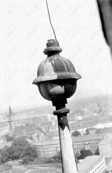 Detail, Zustand der Spitze des alten Rathausturmes, um 1987