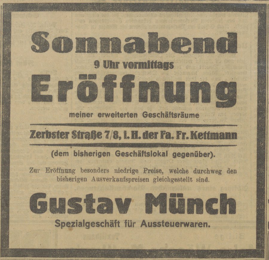 Anzeige von Gustav Münch (Spezialgeschäft für Aussteuerwaren) im Anhalter Anzeiger vom 27. Februar 1926