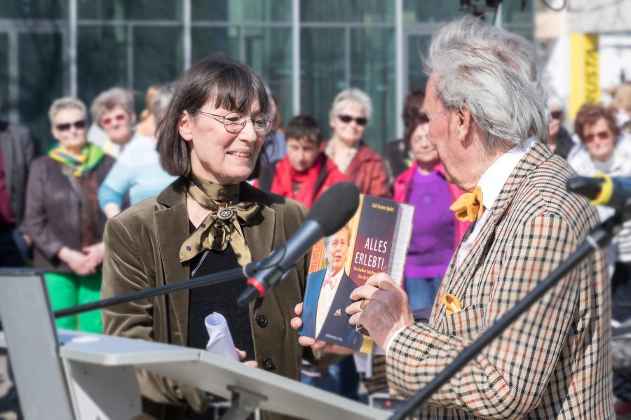 Dr. Ralf-Torsten Speler, Halle (Saale) übergibt sein neues Buch “Alles erlebt!” an die Bildhauerin Christine Rammelt-Hadelich anlässlich der Enthüllung der Erdmannsdorff-Plastik im Dessauer Stadtpark
