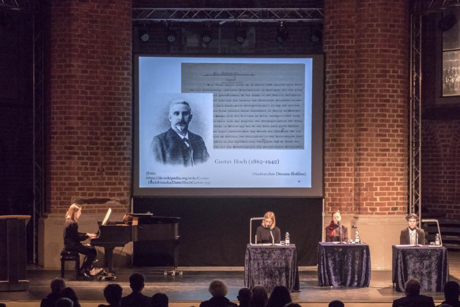 Die Grundlage der Texte bildete vor allem ein über 70-seitiger Bericht von Dr. Gustav Hoch, den er mit dem Titel „Ein Nichtarier“ überschrieben hatte. 2020 hatten Angehörige der Familie Hoch/Gottschalk diesen Bericht sowie weitere außergewöhnliche Dokumente und Fotografien dem Stadtarchiv Dessau-Roßlau übergeben. Unter Federführung der Musikschule „Kurt Weill“ und des Stadtarchivs brachten Jugendliche historisch fundiert und feinfühlig in Wort und Musik ein Programm auf die Bühne, das in würdevoller Weise an den langjährigen SPD-Reichstagsabgeordneten Gustav Hoch, seinen Sohn Dr. Gustav Hoch, dessen Frau Dr. Hanna Hoch, die gemeinsamen Söhne Fritz und Karl Hoch sowie Selma Gottschalk, die Mutter von Hanna Hoch, erinnerte. Sechs Menschen von 6 Millionen, die dem Holocaust zum Opfer fielen. Mit der Schlussaufforderung des Programms, heute und in der Zukunft nicht zu schweigen, wenn Antisemitismus sich offenbart, entließen die Jugendlichen ein bewegtes und nachdenkliches Publikum. Dr. Ralf Seidel, Angehöriger der Familie Hoch/Gottschalk, der als Ehrengast an der Veranstaltung teilgenommen hatte, würdigte das Engagement der jungen Generation, die gezeigt habe, dass das Gedenken an die Opfer des Holocaust in Dessau-Roßlau bewahrt bleibe.
