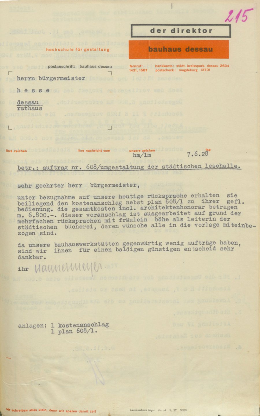 Schreiben des Bauhausdirektors Hannes Meyer an Bürgermeister Fritz Hesse betr. Umgestaltung der Städtischen Lesehalle, 7. Juni 1928