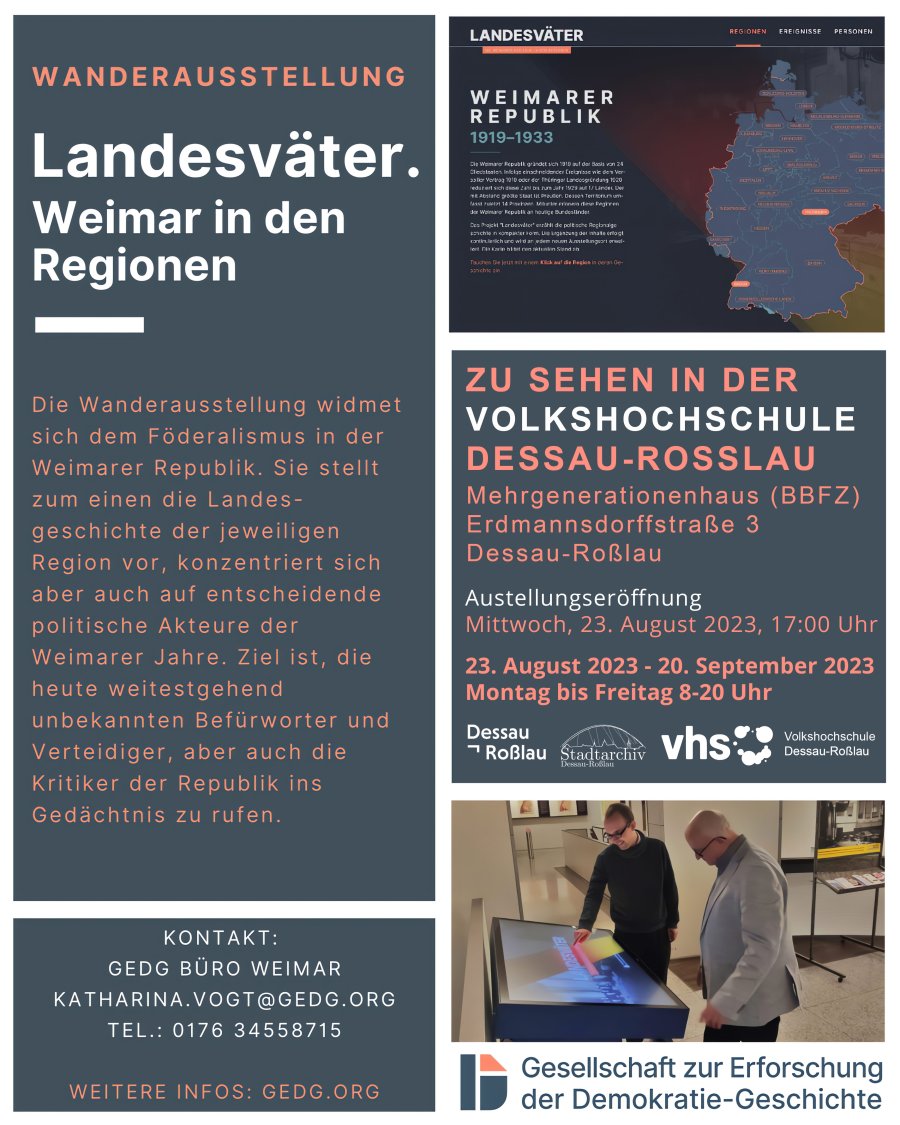 Die Volkshochschule Dessau-Roßlau beginnt ihr Herbstsemester nach den Sommerferien mit einem neuen, inhaltlich breit angelegten Bildungsprogramm. In diesem Rahmen präsentiert das Stadtarchiv Dessau-Roßlau in Kooperation mit der Volkshochschule die Wanderausstellung „Landesväter. Die Weimarer Republik in den Regionen“ der Gesellschaft zur Erforschung der Demokratie-Geschichte (GEDG).
