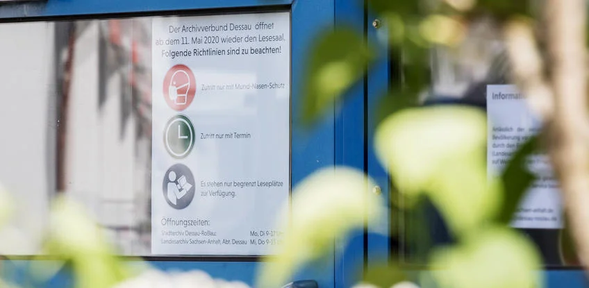 The Archive centre Dessau will be open to the public again from Thursday, 20 May 2021. Opening hours will remain restricted for the time being, and the number of usable seats in the reading room is limited. Access to the archive building is only permitted with an FFP2 or medical mask and with a pre-confirmed appointment.