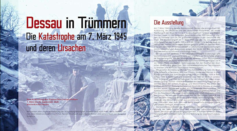 Die Ausstellung „Dessau in Trümmern“ wurde am 7. März 2020 um 14.00 Uhr im Rahmen des Gedenkrundgangs „Versöhnung schafft Frieden“ in der Dessauer Marienkirche eröffnet. Aufgrund der aktuellen Lage ist die Ausstellung derzeit jedoch geschlossen. Wir möchten Ihnen trotzdem die Möglichkeit bieten die Ausstellung zu sehen. Deshalb stellen wir Ihnen die Inhalte der Ausstellungstafeln und Ausstellungsstationen nunmehr auf unserer Homepage zur Verfügung. Sie erhalten damit die Möglichkeit eines virtuellen Rundgangs von Station zu Station.
