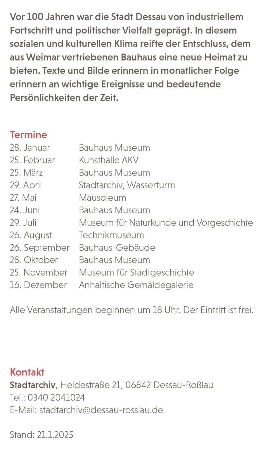 Eine Lesereihe der Stadt Dessau-Roßlau zum 100-jährigen Jubiläum des Bauhaus Dessau wird das gesellschaftliche Leben, die politischen, wirtschaftlichen, baulichen sowie kulturellen Ereignisse und Entwicklungen in der Stadt Dessau in chronologischer Form von Januar bis Dezember 1925 beleuchten und dabei alle genannten Facetten aufgreifen. Neben den damals als handelnde Personen im Zentrum des Geschehens stehenden Menschen wird das Buch auch diejenigen Zeitgenossen in der Stadt in den Blick nehmen, die mit den rasanten Veränderungen ihrer Lebenswelt umgehen und zurechtkommen mussten.