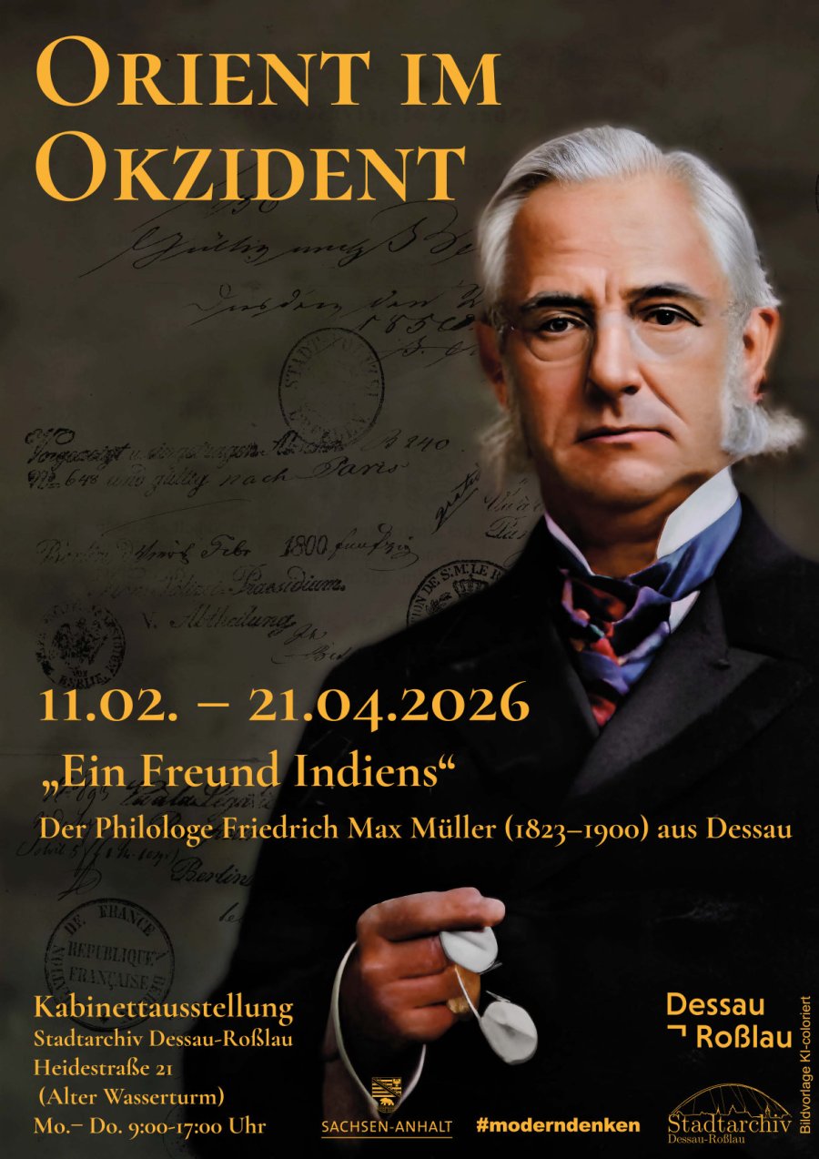 Als er im Jahr 1900 starb, trauerte man in der ganzen Welt. Nachrufe bezeichneten ihn als „Freund Indiens“ und „Der Welt größten Philologen“. Gemeint war der 1823 in Dessau geborene Philologe Friedrich Max Müller, der als Professor in Oxford, mit seinen Sanskritforschungen und zahlreichen grundlegenden Publikationen solchen Weltruhm erlangt hatte. Friedrich Max Müller wird im Mittelpunkt einer Veranstaltung am Dienstag, 10. Januar 2026 um 18.00 Uhr im Vortragssaal des Archivverbunds Dessau, Heidestraße 21 (Alter Wasserturm) stehen. Angeboten werden ein Vortrag des Archivleiters Dr. Frank Kreißler über das Leben und das wissenschaftliche Wirken des großen Philologen sowie die Eröffnung einer Kabinettausstellung unter dem Titel „Orient im Okzident, Friedrich Max Müller (1823–1900). Ein Freund Indiens“, in der zahlreiche Dokumente, Bildzeugnisse und Bücher aus dem im Stadtarchiv (Anhaltische Landesbücherei Dessau) befindlichen Nachlass Friedrich Max Müllers gezeigt werden.