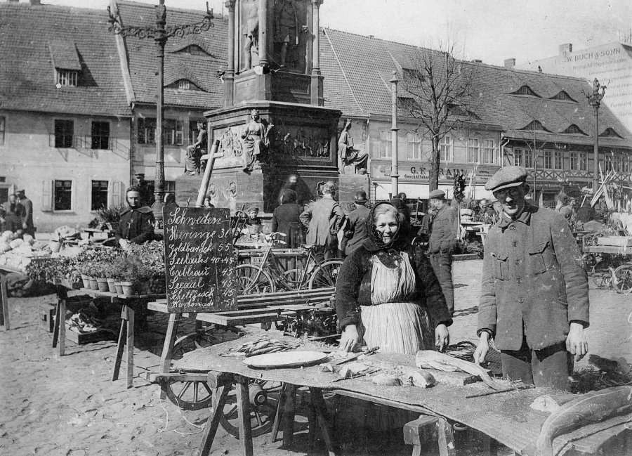 Dessau, Kleiner Markt, Fisch und Blumenhändler vor dem Jubeldenkmal. Aufnahme 1926, StadtADR FI 3b-0106