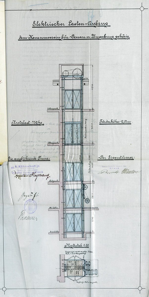 Der Dessauer Konsumverein verzeichnete einen rasanten Aufschwung. Schon 1906 war die wirtschaftliche Lage der Genossenschaft so gut, dass sie in einer eigenen Immobilie in der Taubenstraße 68 eine Betriebszentrale mit Zentrallager, Fleischerei, Butterkneterei und Butterformerei, eine Großbäckerei, der Fuhrpark und eine Zentrale für die Erzeugung von elektrischer Energie einrichten konnte. Die Betriebszentrale wurde mit modernen technischen Einrichtungen und Maschinen ausgestattet. Dazu zählte im Bereich der Bäckerei auch ein elektrischer Lastenaufzug des Herstellers A. Kühnscherf jun. bzw. Dresdner Gasmotorenfabrik, der eine Tragfähigkeit von 750 kg oder 10 Personen hatte und eine Fahrgeschwindigkeit von 0,3 Meter pro Sekunde erreichte. In einer im Bestand Polizeiverwaltung erhaltenen Akte im Stadtarchiv Dessau-Roßlau sind Unterlagen zu den technischen Daten und eine Bauzeichnung dieses Lastenaufzugs erhalten, die das Stadtarchiv als Archivale des Monats April 2026 präsentiert. Die Baulichkeiten der ehemaligen Konsum-Betriebszentrale an der Taubenstraße sind heute verschwunden.